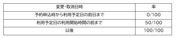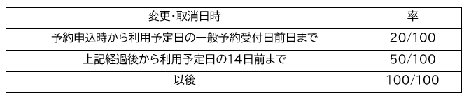 下記の率を取消・変更する利用料に乗じた額が取消変更料になります。